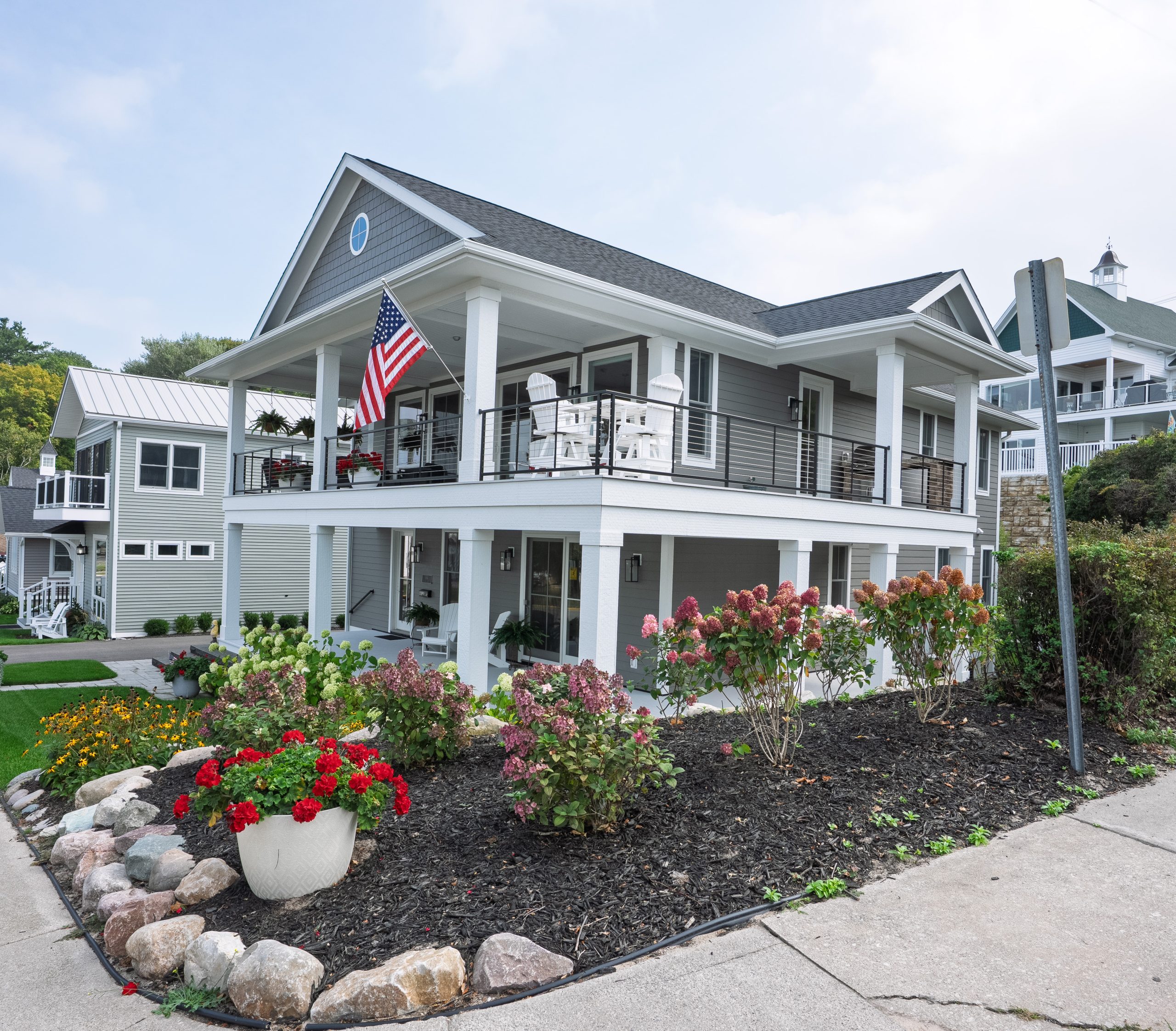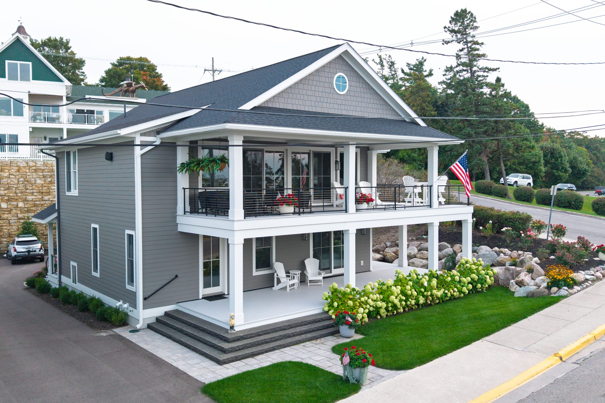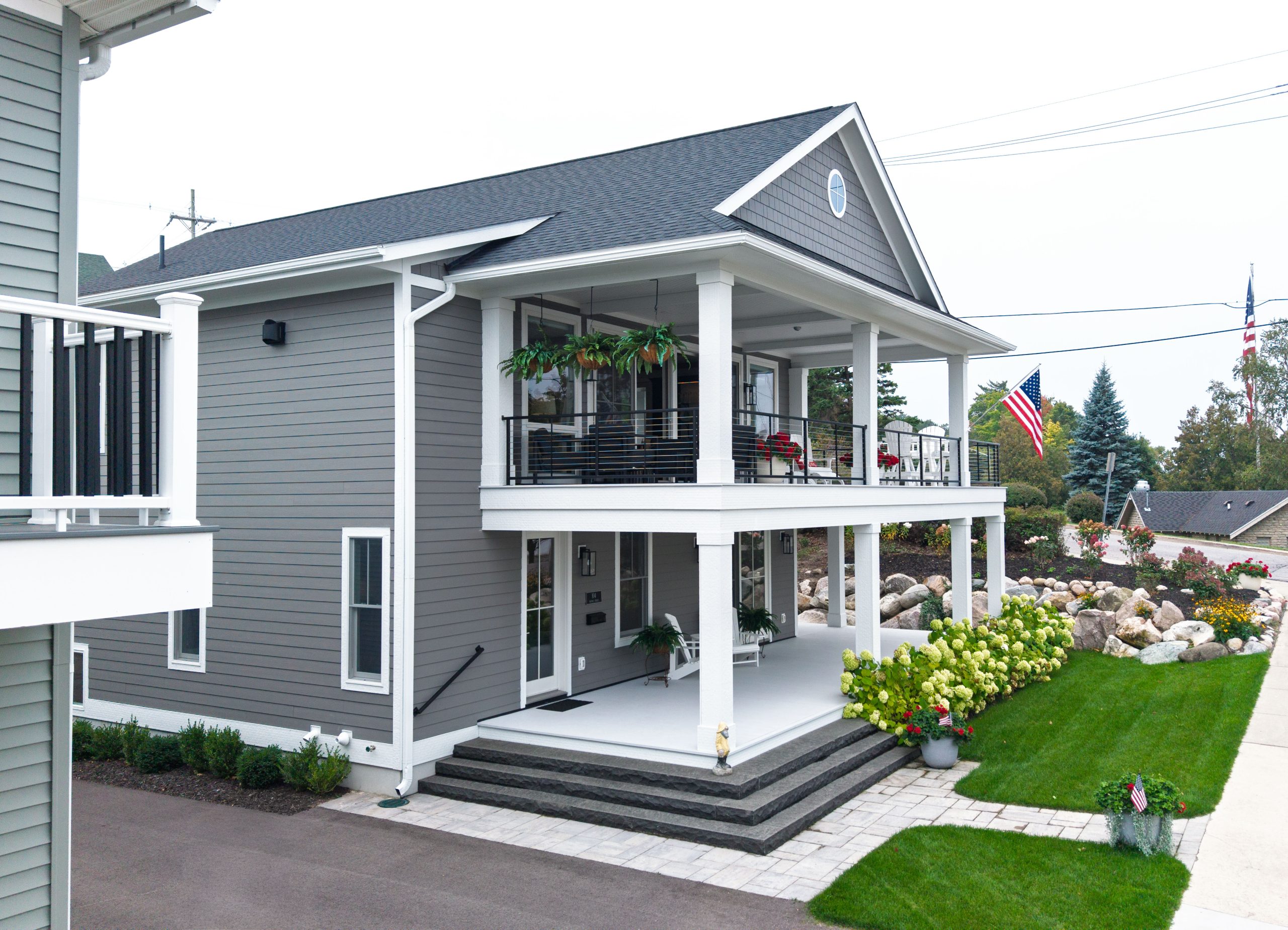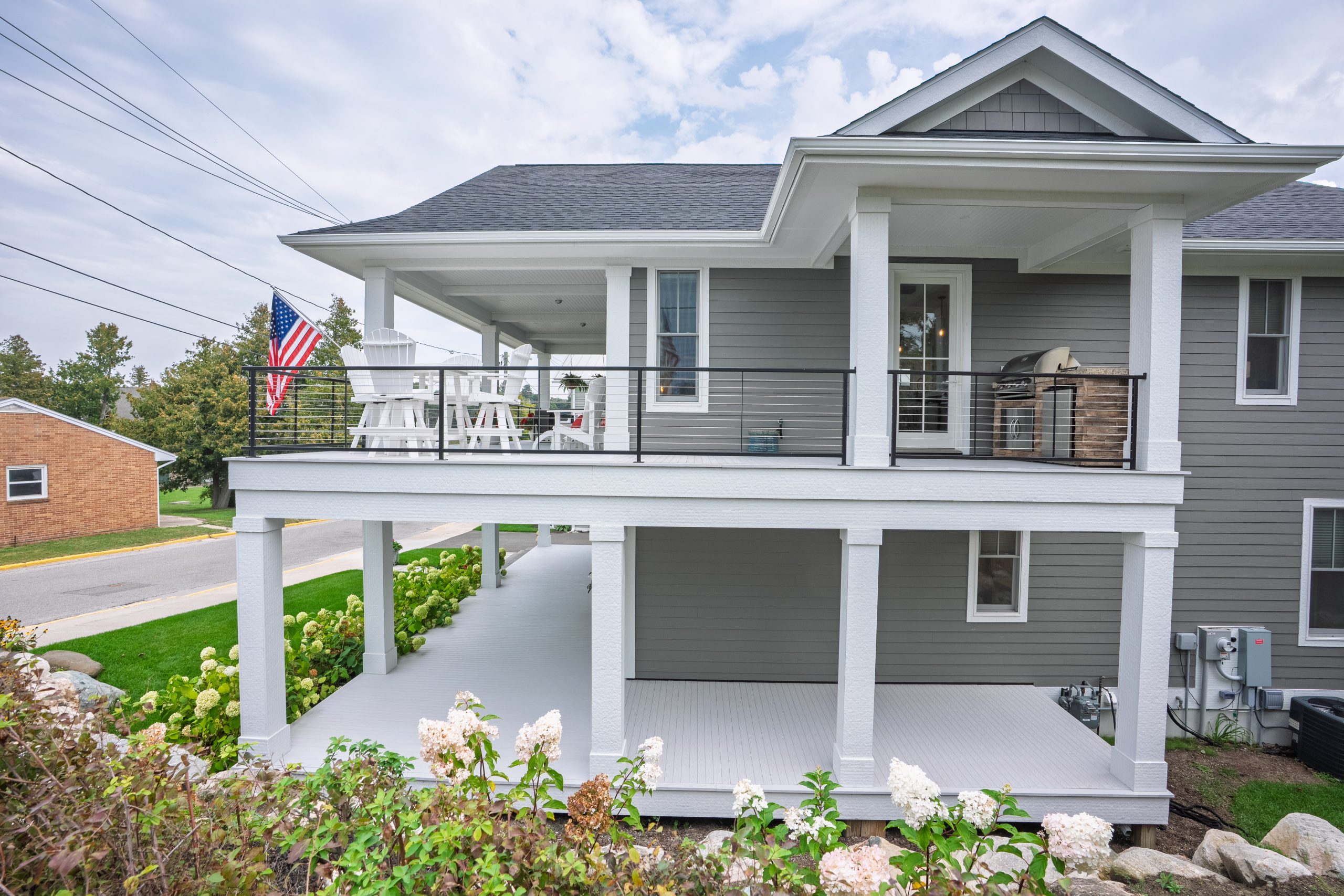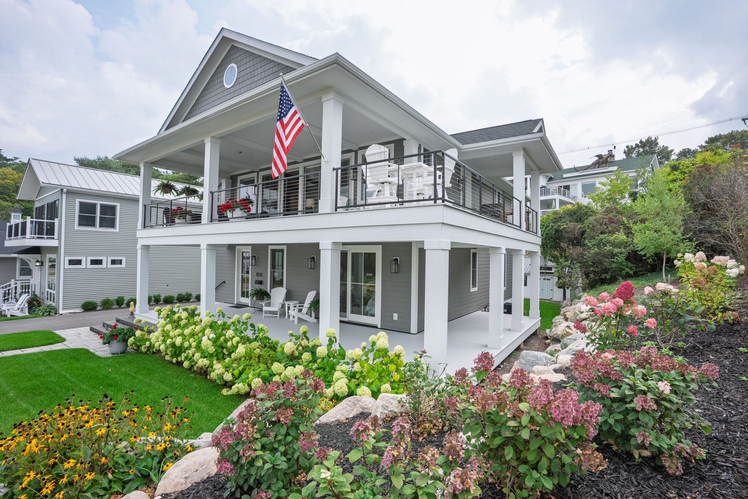 This Lake Michigan residence bends timeless design with modern functionality. The home features a symmetrical façade, prominent gabled rooflines, and expansive covered porches that create a welcoming, open-air aesthetic. Crisp white columns and railings complement the soft gray siding, while large windows and elevated outdoor spaces maximize natural light and panoramic views of Michigan Beach.