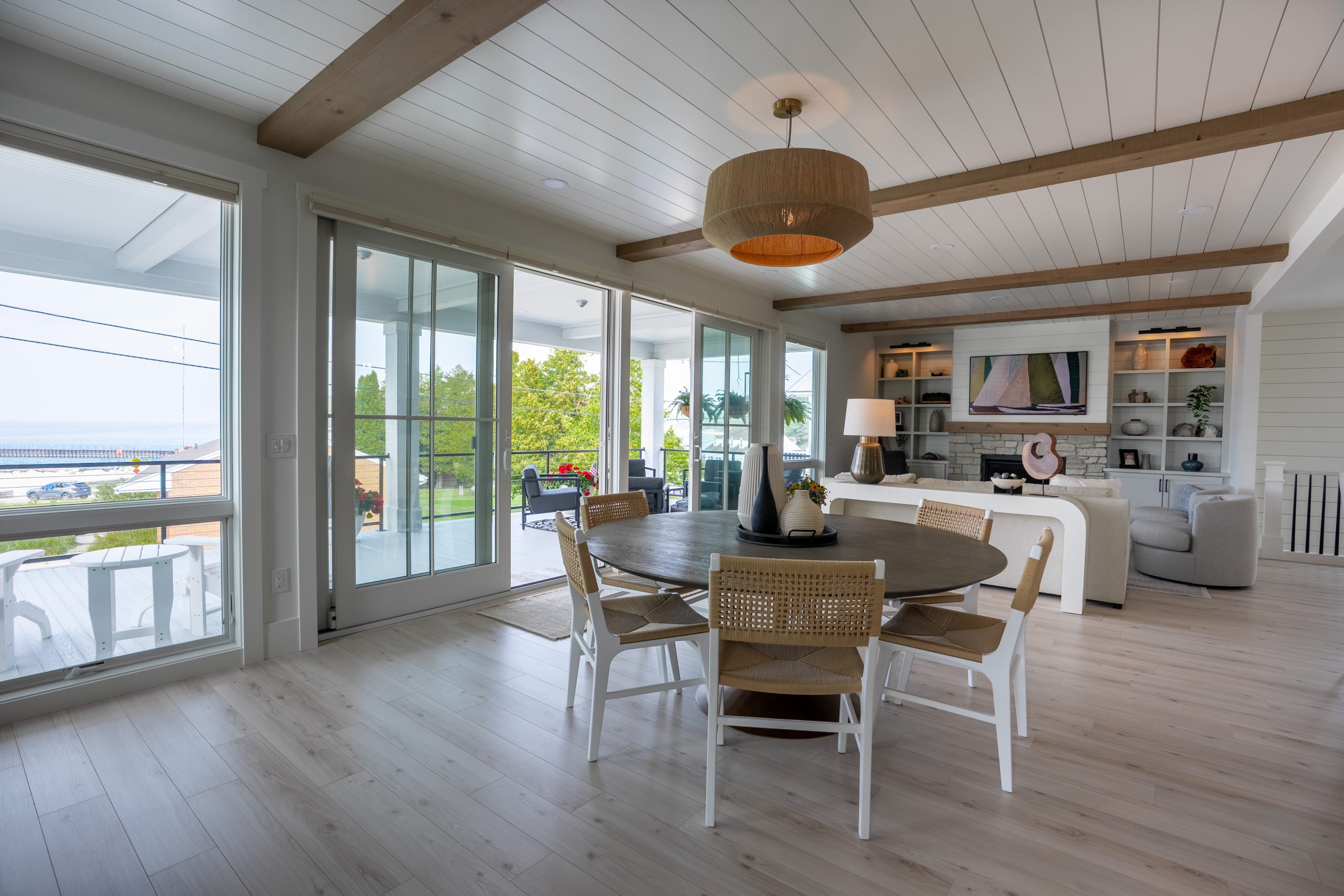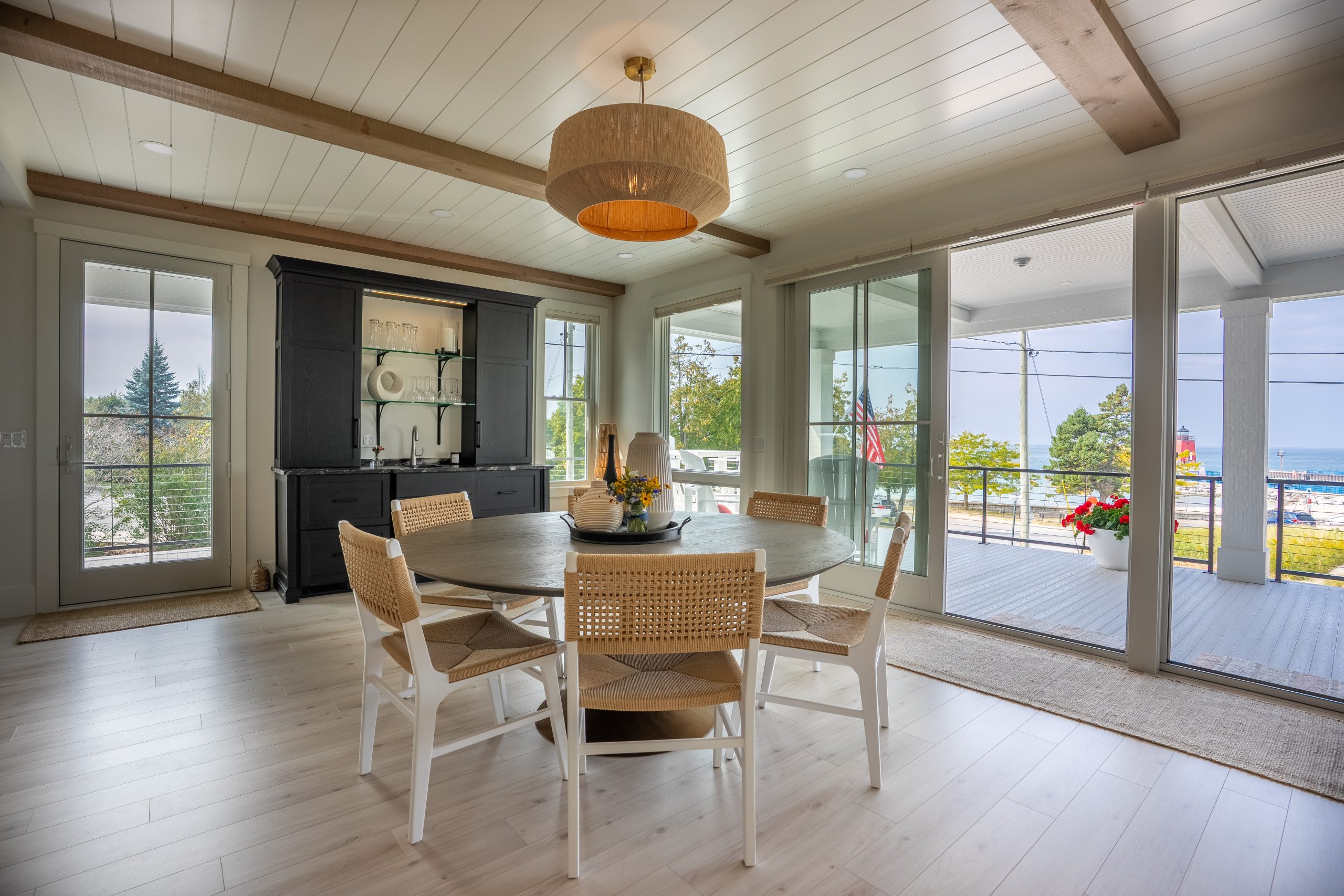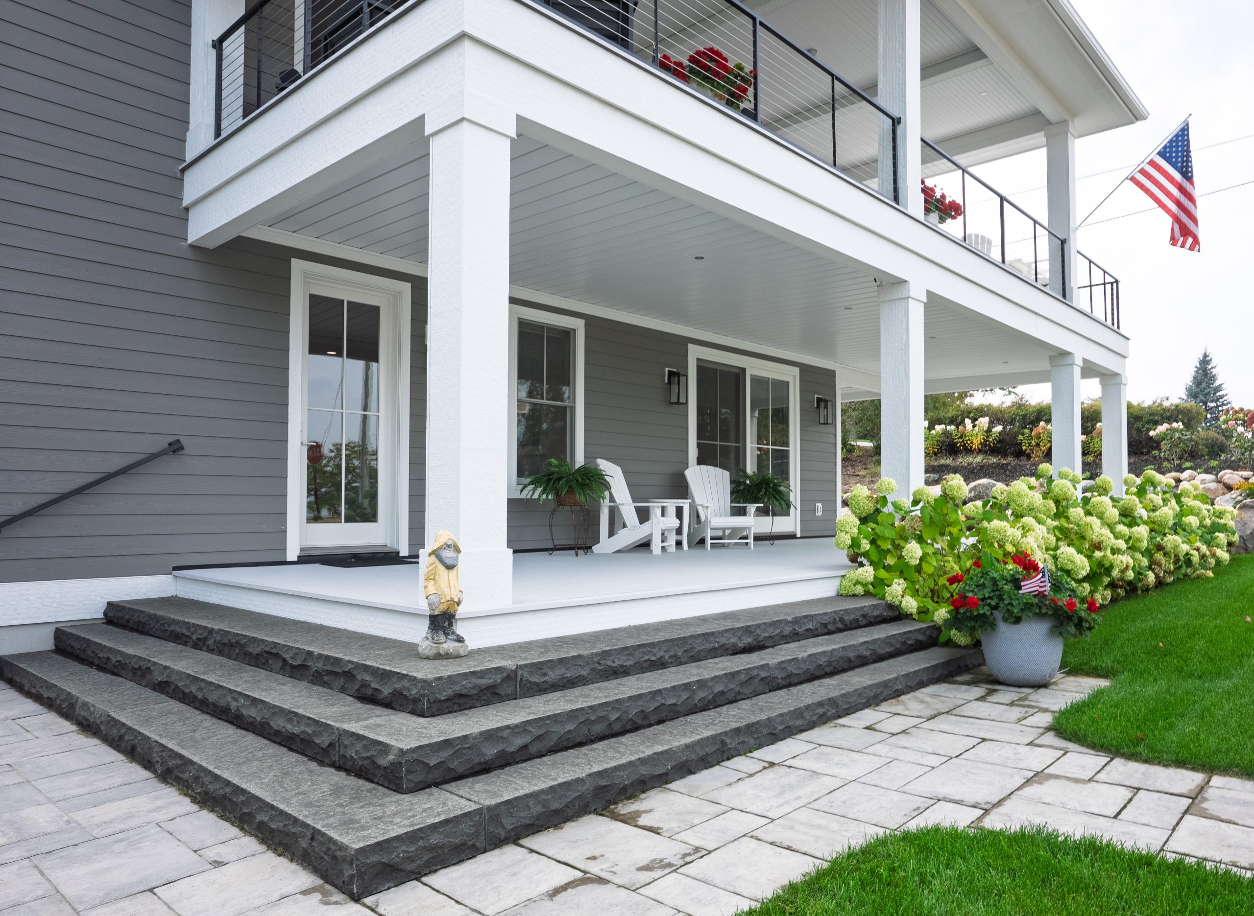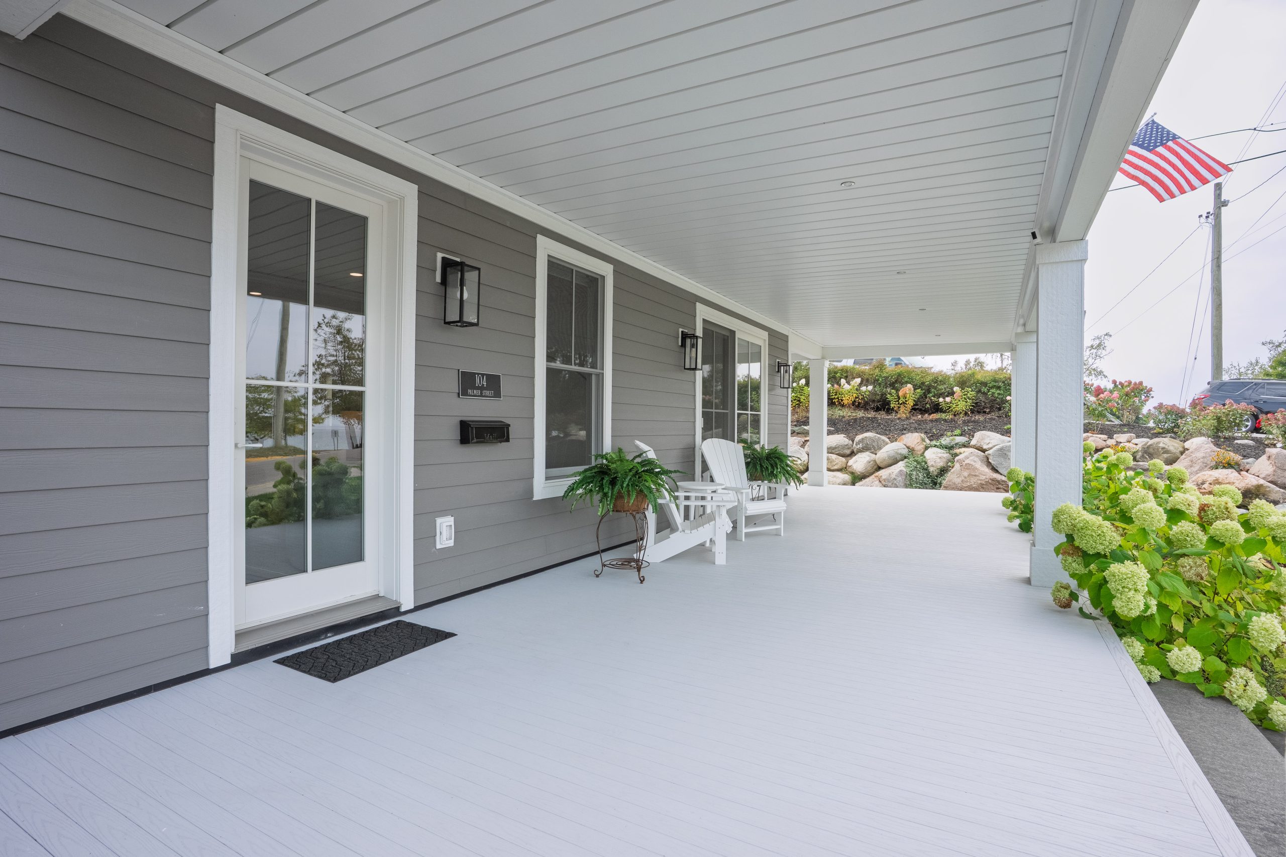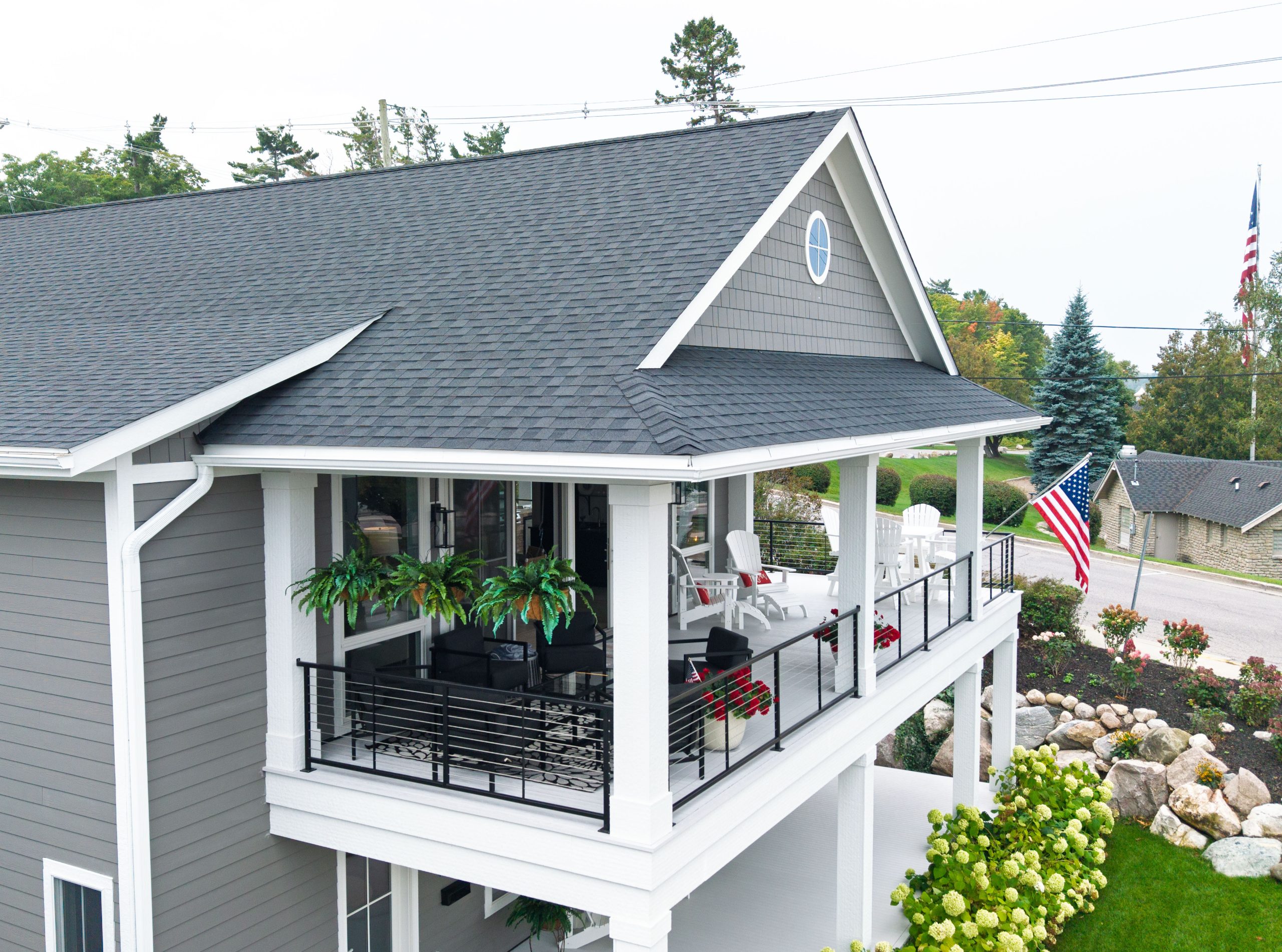This Lake Michigan residence bends timeless design with modern functionality. The home features a symmetrical façade, prominent gabled rooflines, and expansive covered porches that create a welcoming, open-air aesthetic. Crisp white columns and railings complement the soft gray siding, while large windows and elevated outdoor spaces maximize natural light and panoramic views of Michigan Beach.