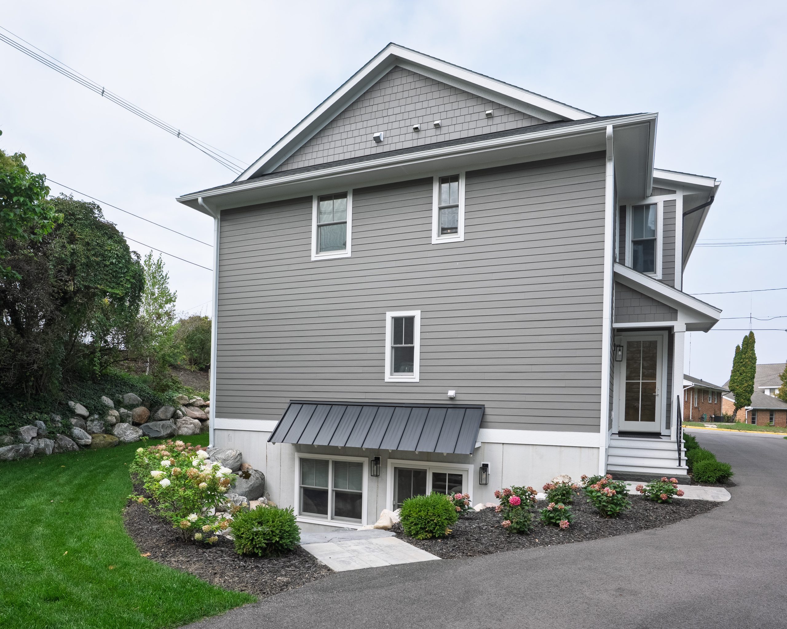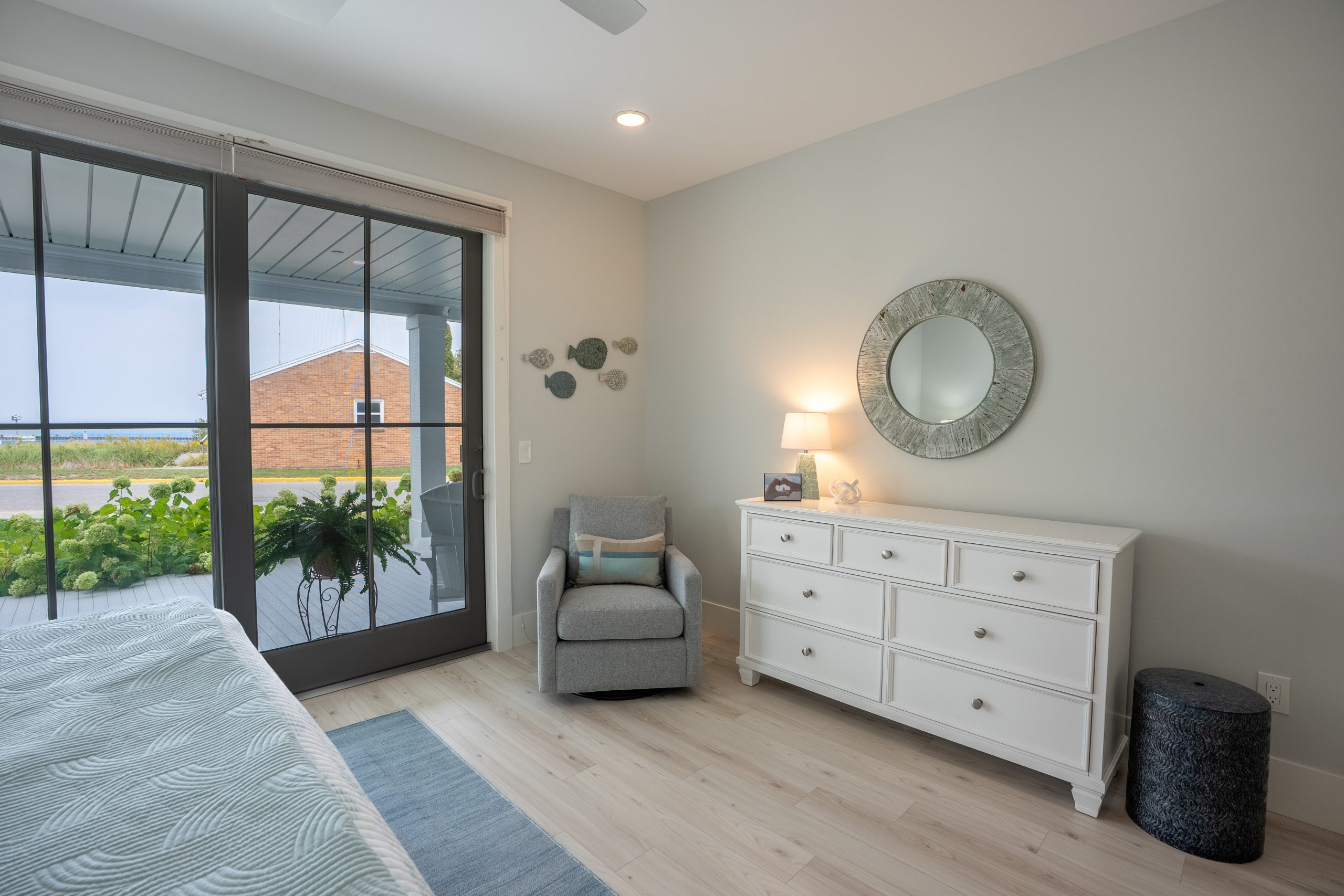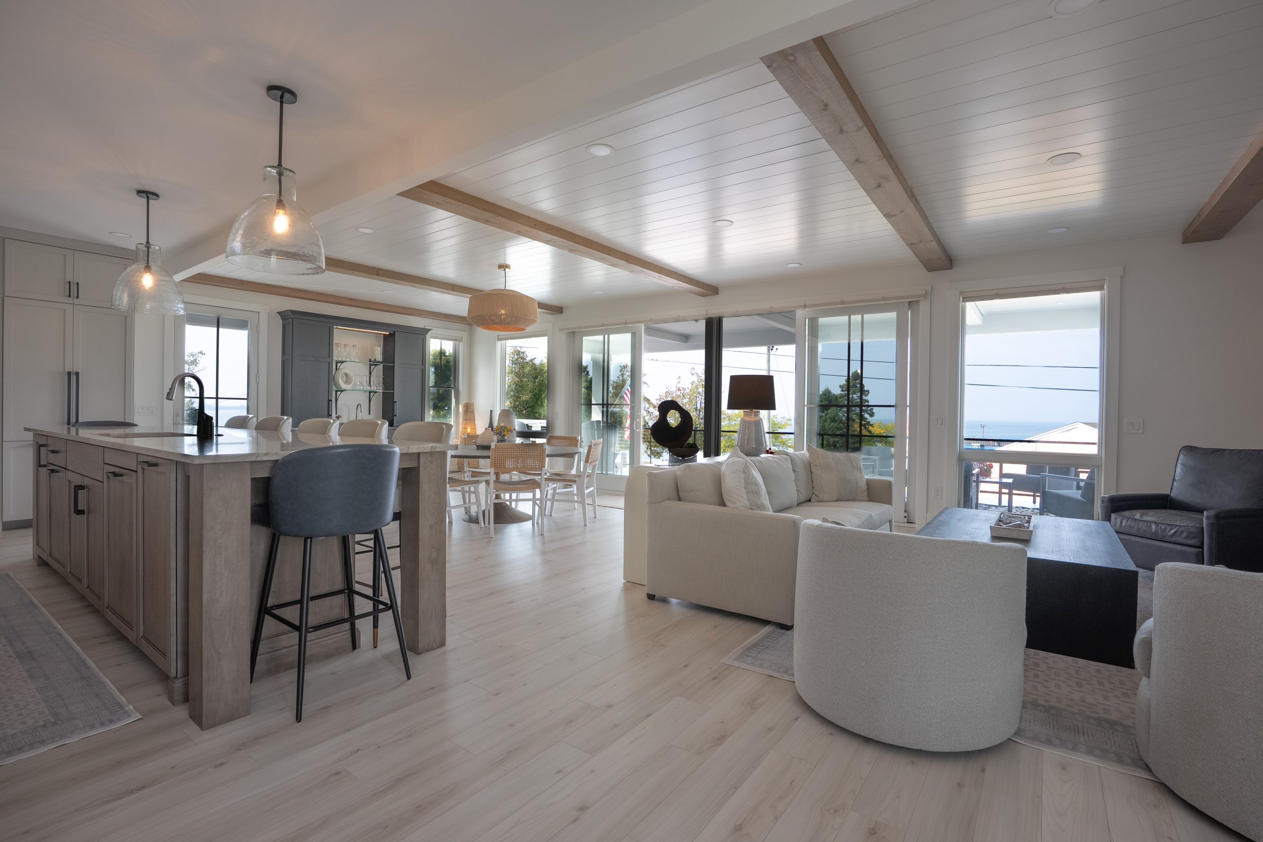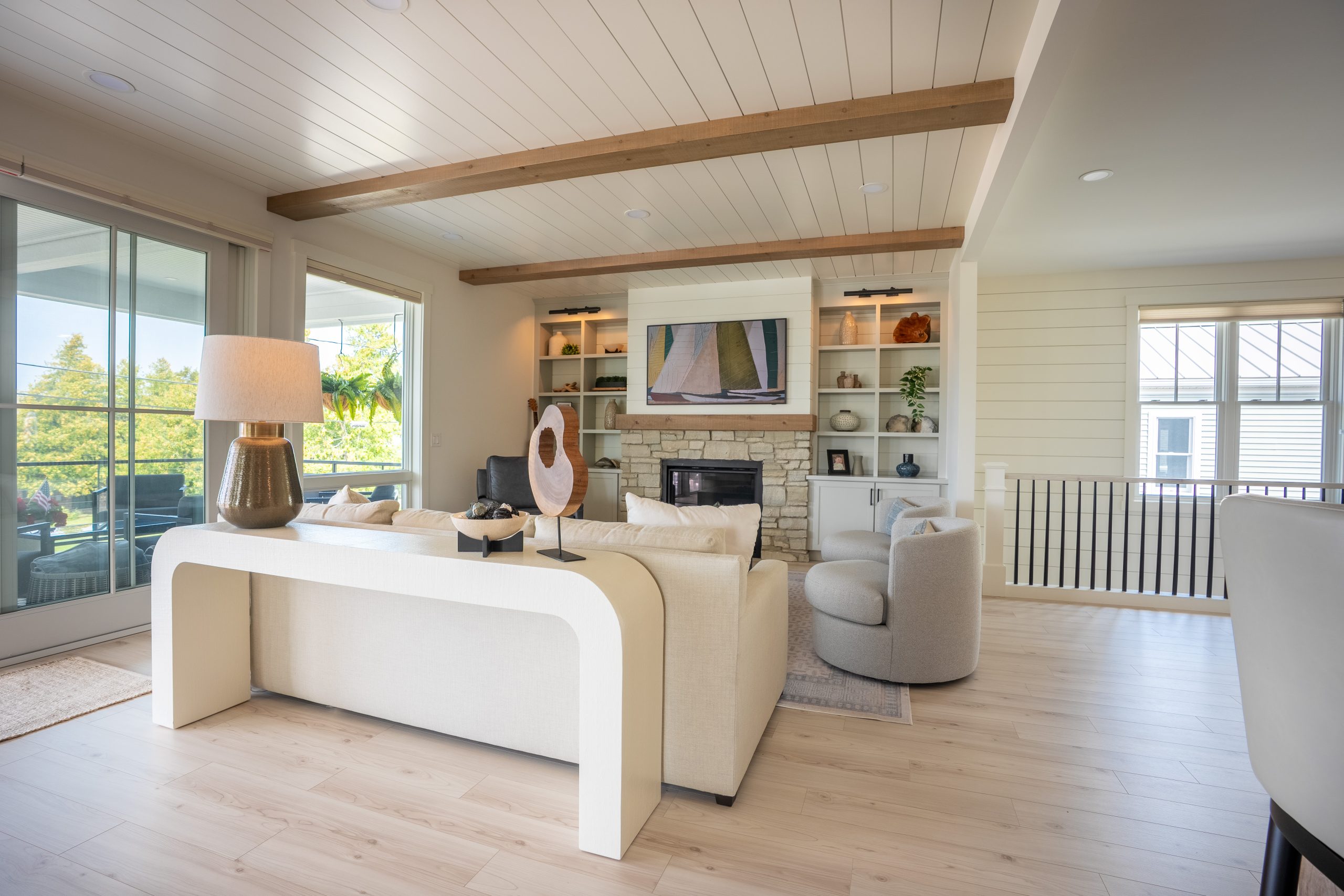 This Lake Michigan residence bends timeless design with modern functionality. The home features a symmetrical façade, prominent gabled rooflines, and expansive covered porches that create a welcoming, open-air aesthetic. Crisp white columns and railings complement the soft gray siding, while large windows and elevated outdoor spaces maximize natural light and panoramic views of Michigan Beach.