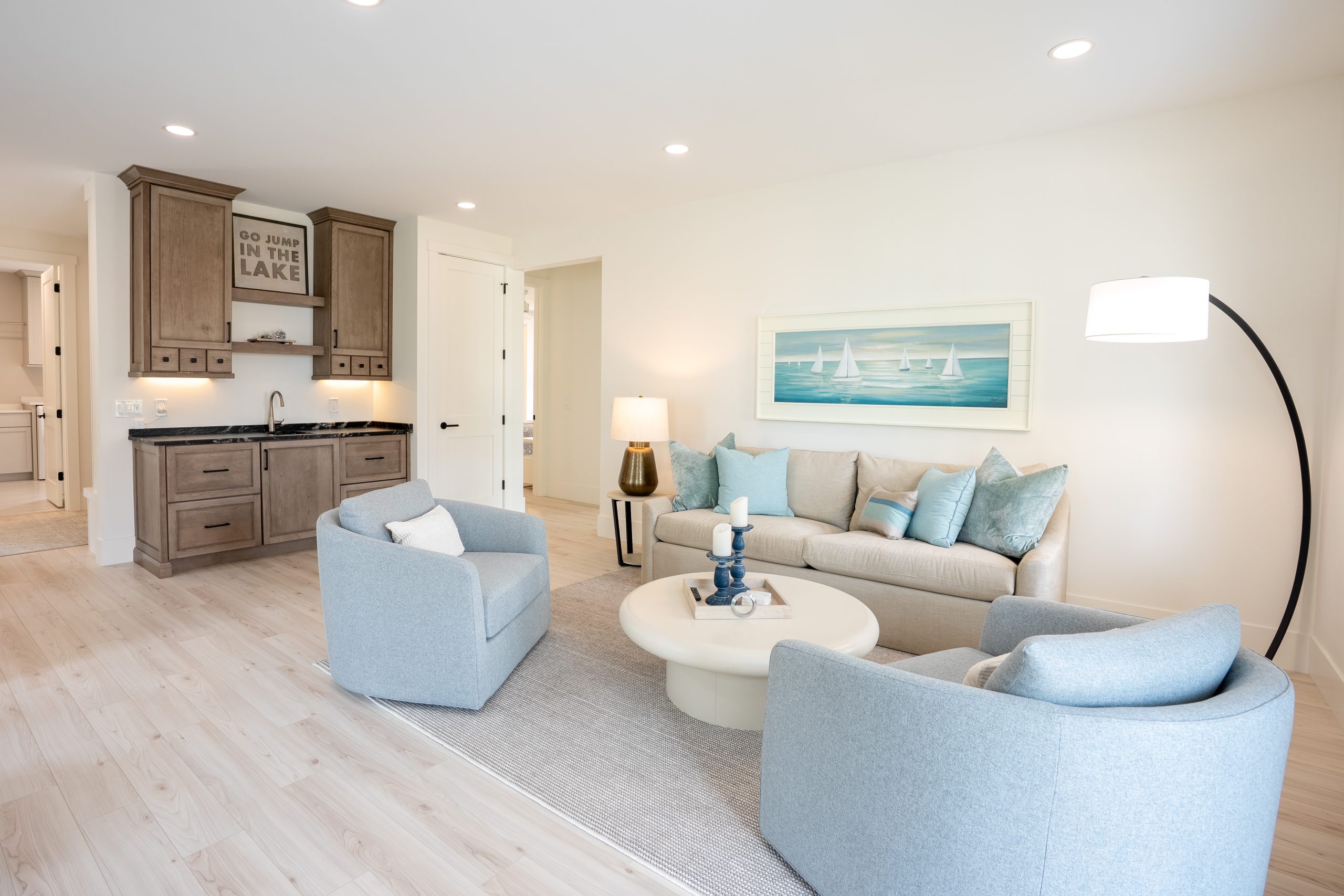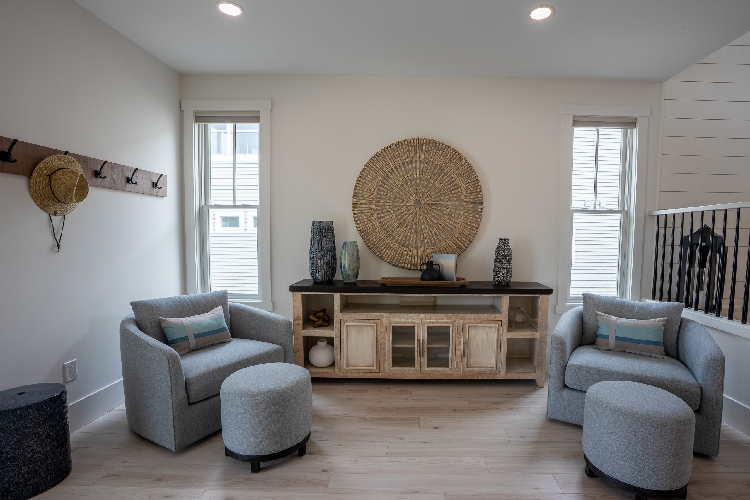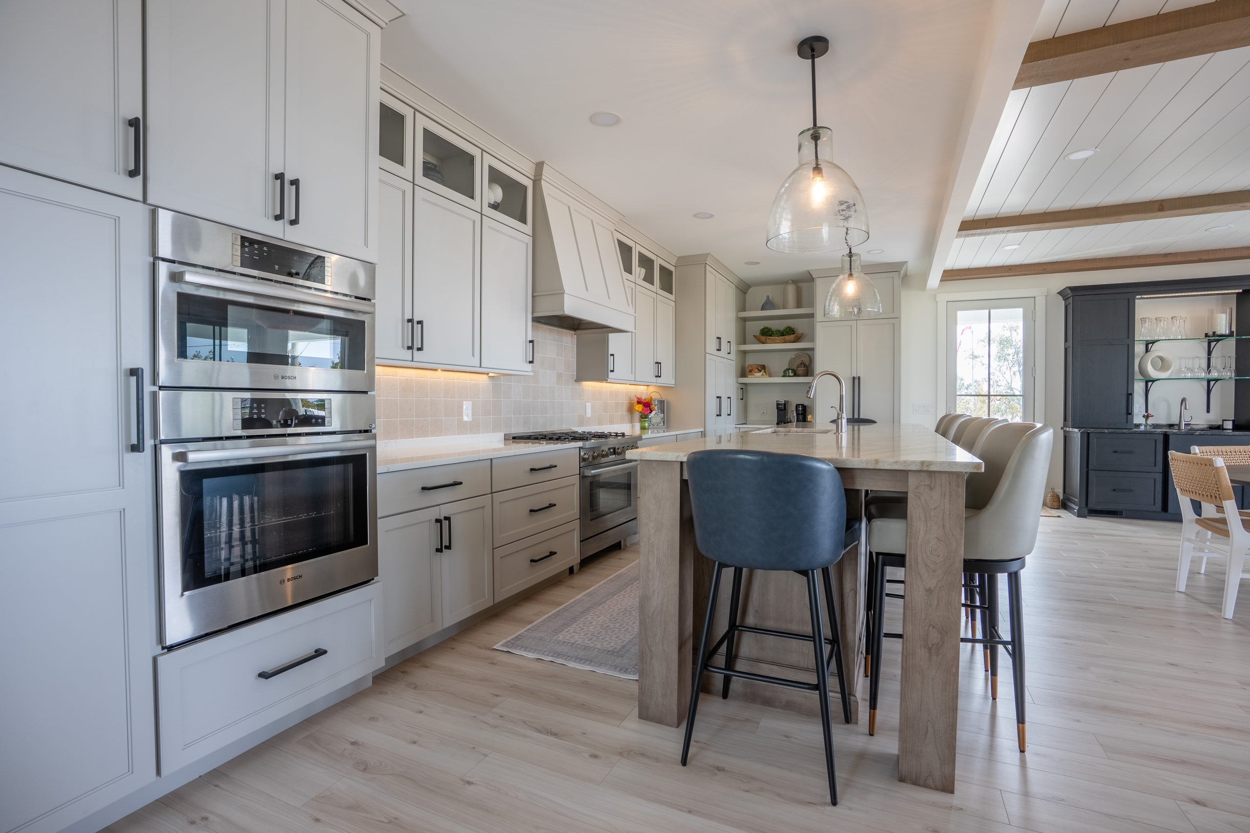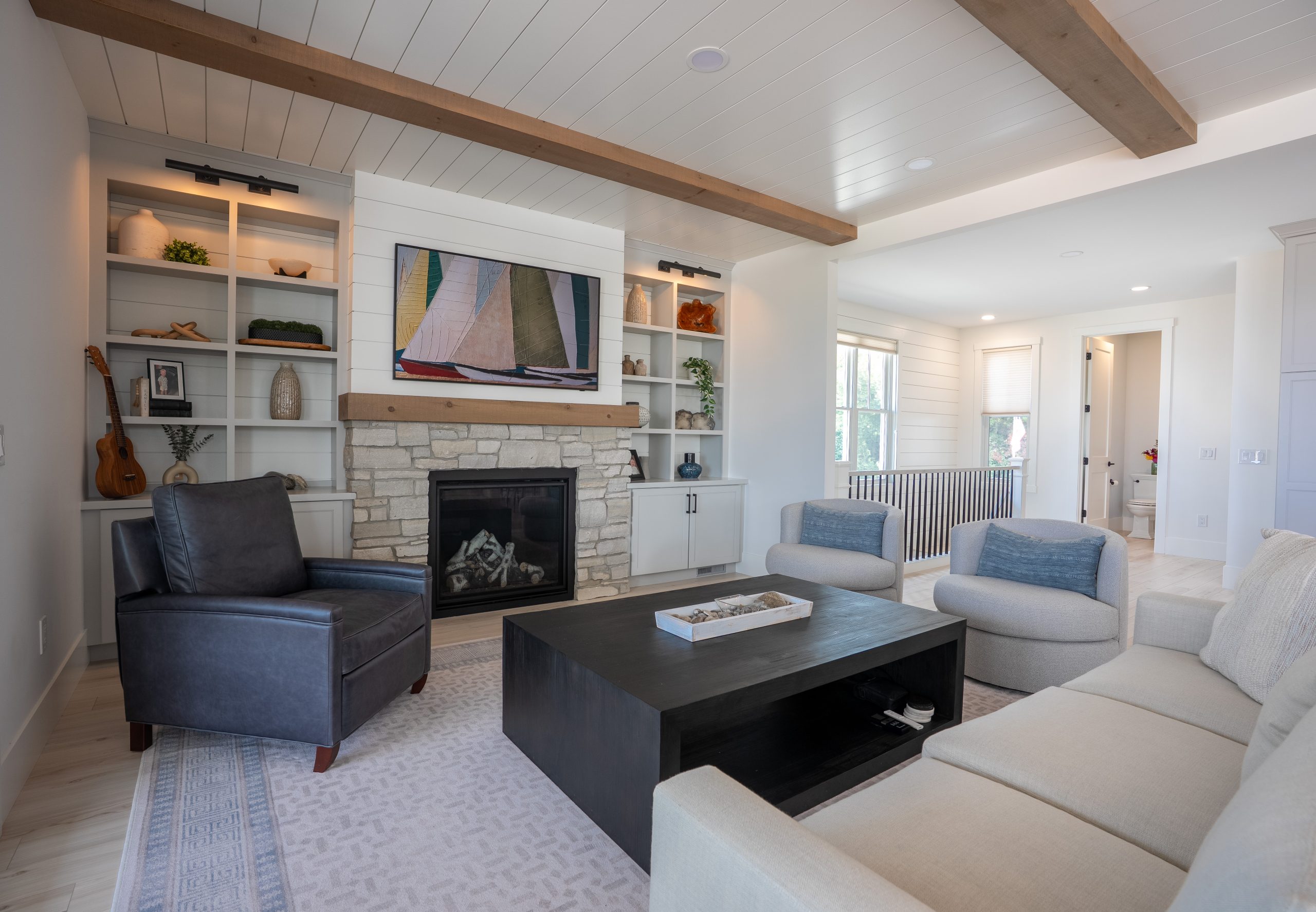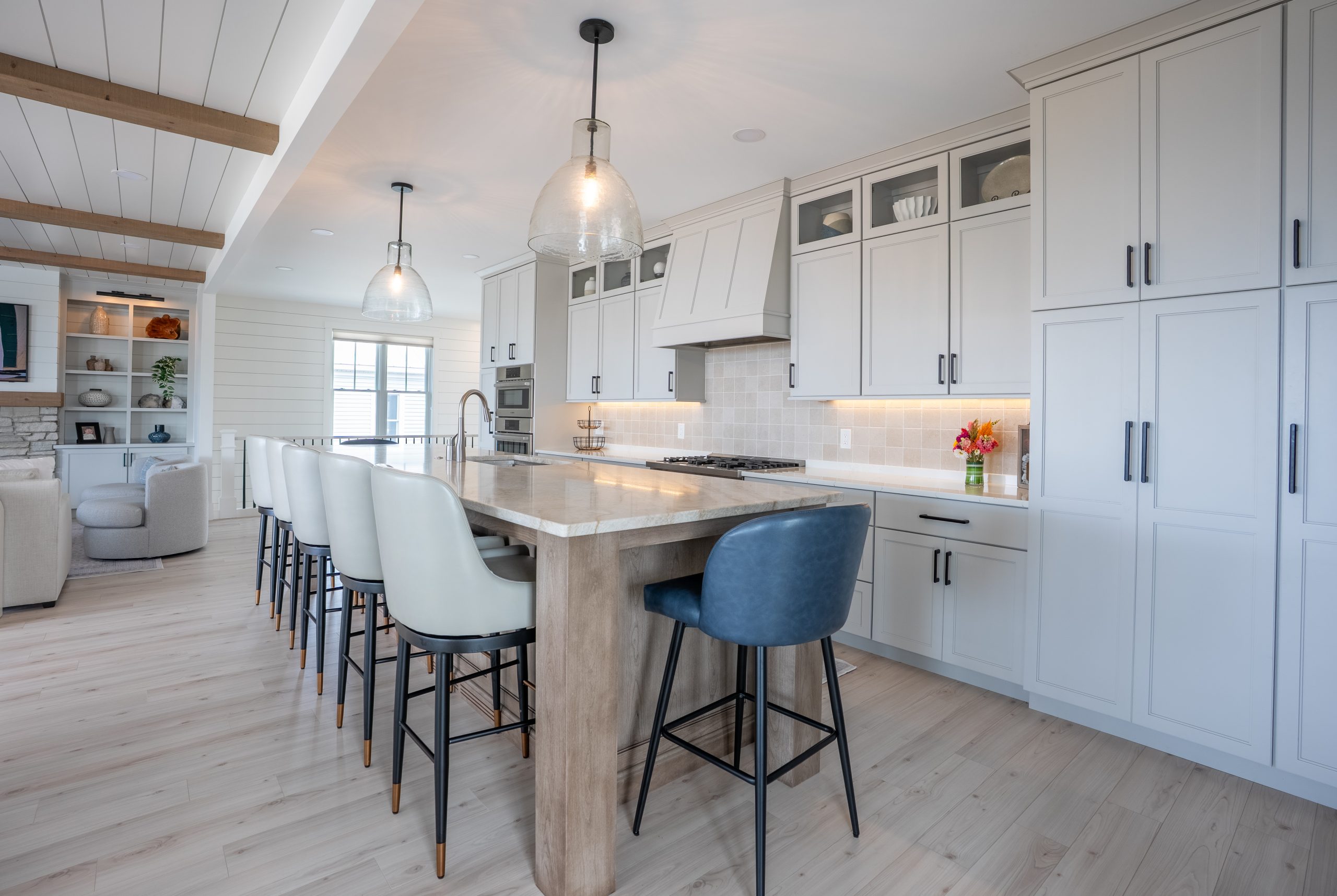 This Lake Michigan residence bends timeless design with modern functionality. The home features a symmetrical façade, prominent gabled rooflines, and expansive covered porches that create a welcoming, open-air aesthetic. Crisp white columns and railings complement the soft gray siding, while large windows and elevated outdoor spaces maximize natural light and panoramic views of Michigan Beach.