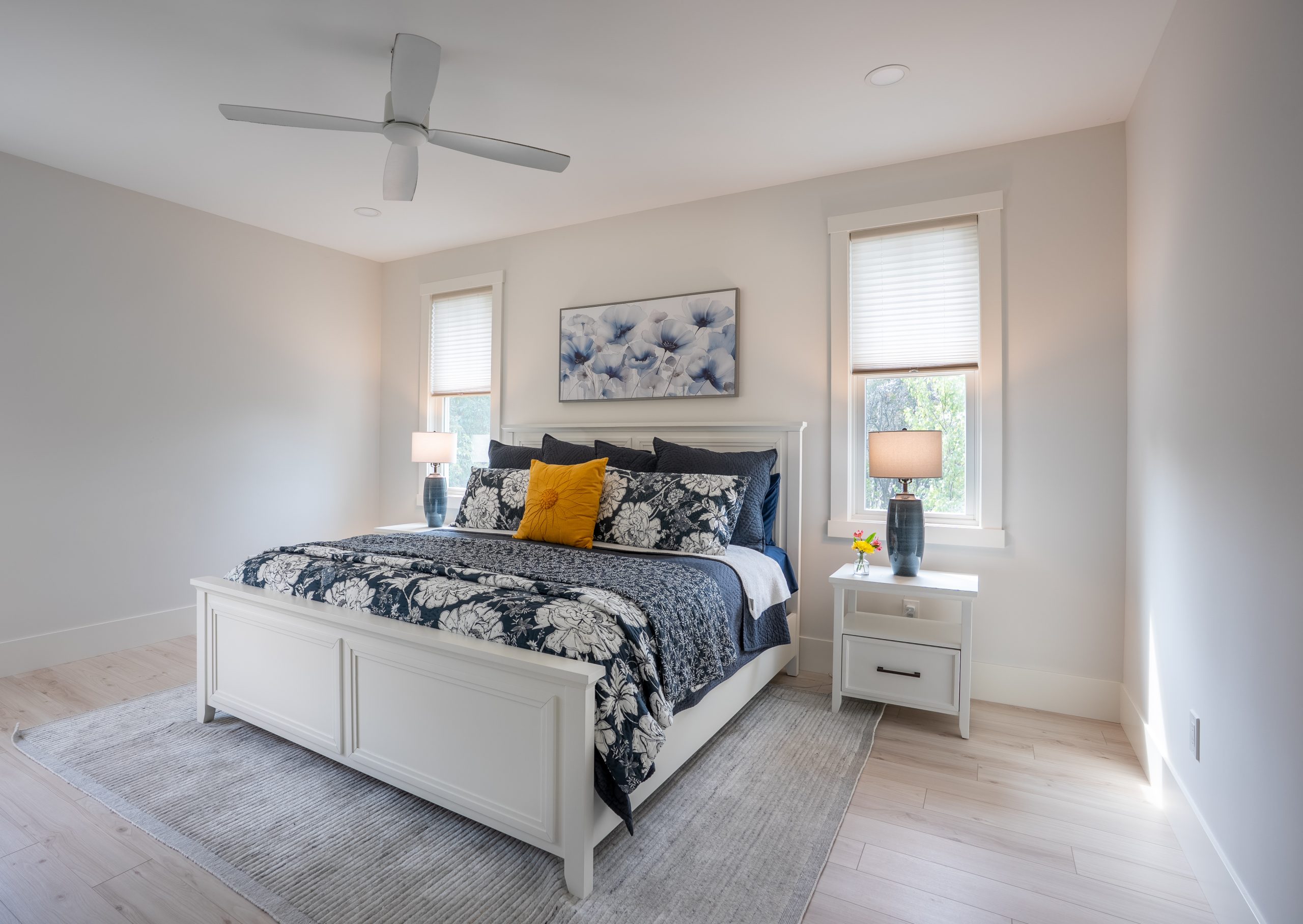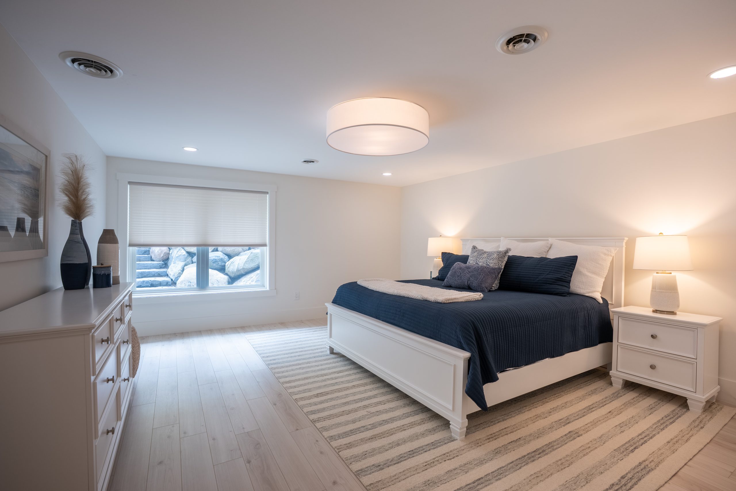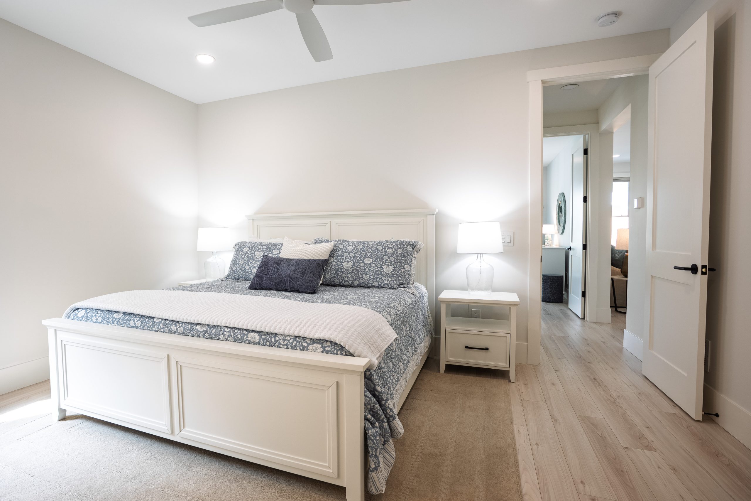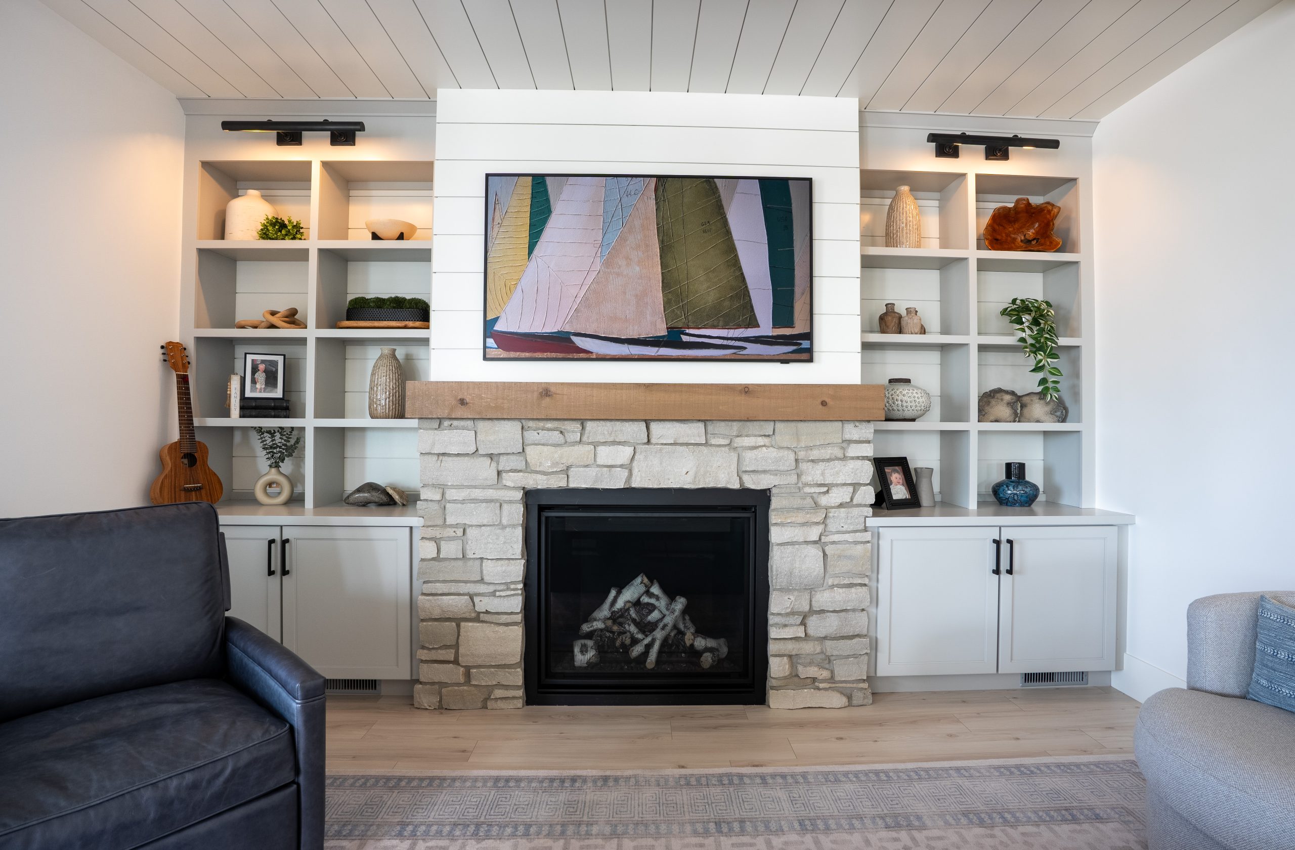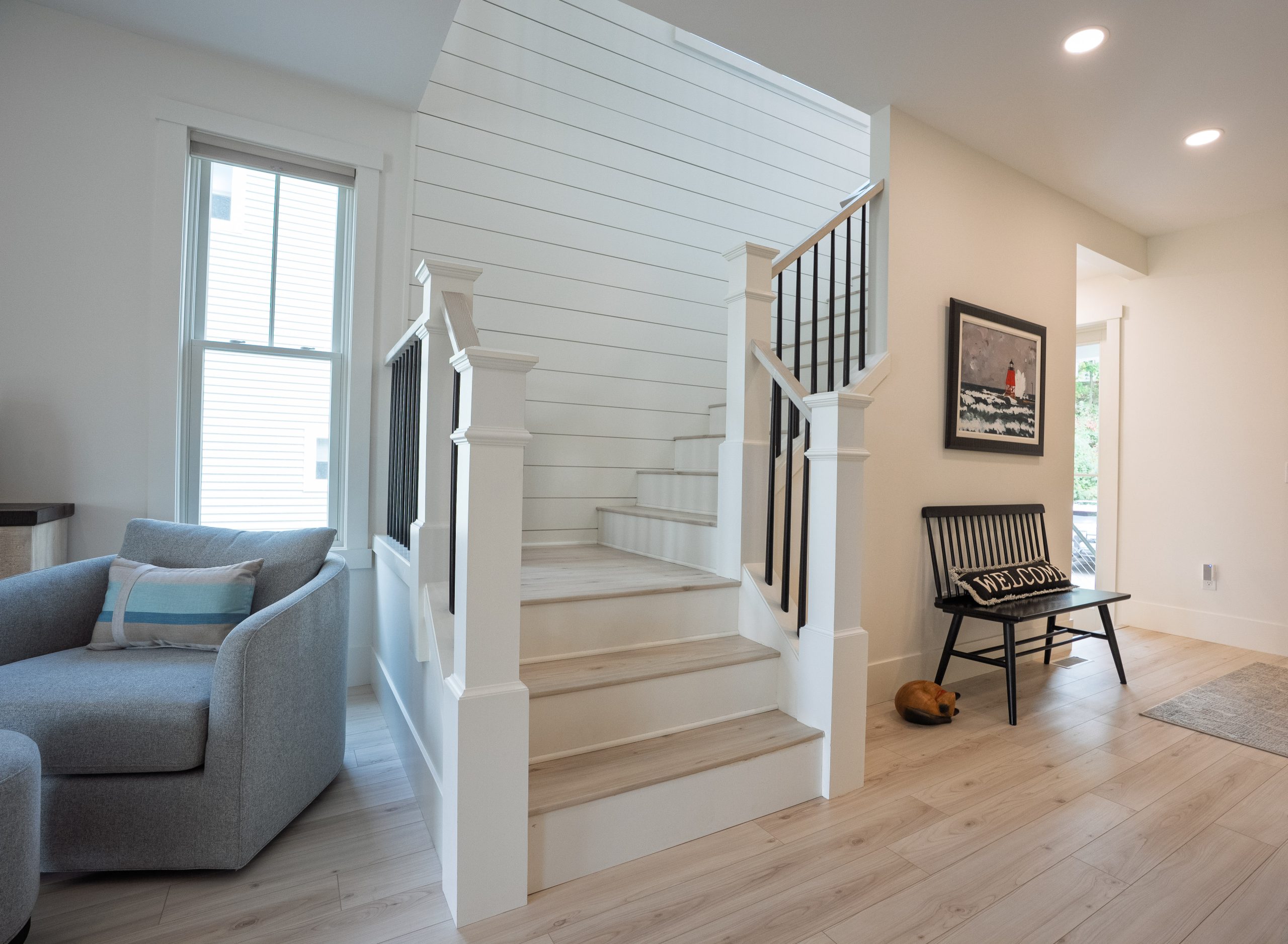 This Lake Michigan residence bends timeless design with modern functionality. The home features a symmetrical façade, prominent gabled rooflines, and expansive covered porches that create a welcoming, open-air aesthetic. Crisp white columns and railings complement the soft gray siding, while large windows and elevated outdoor spaces maximize natural light and panoramic views of Michigan Beach.